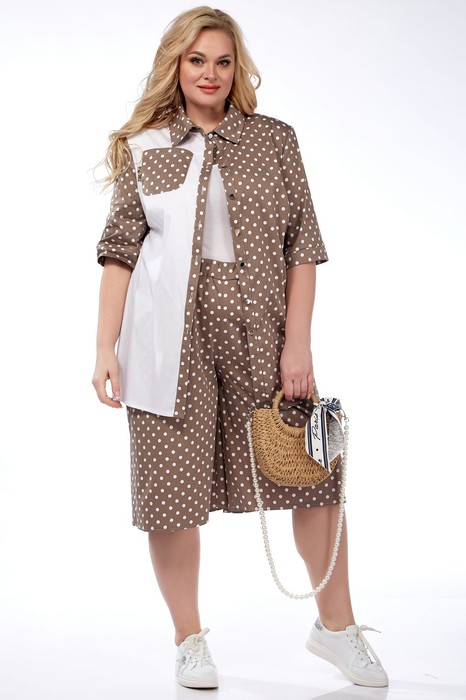 Костюм женский свободного силуэта. Состоит из блузки и шорт. Выполнен из хлопковой ткани. Блузка с центрально-бортовой застежкой на петли и пуговицы, воротник втачной на стойке, одна из полочек выполнена из контрастной ткани и украшена карманом, в боковых швах разрезы, рукав короткий втачной. Шорты свободные, в боковых швах карманы, пояс на резинке.
