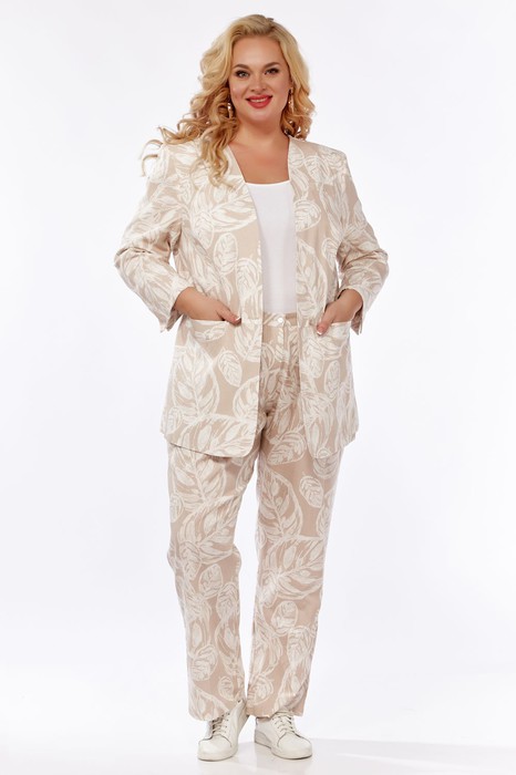 Костюм женский двухпредметный полуприлегающего силуэта,состоит из жакета и брюк. Жакет с декоративным подрезом по переду полочки, рукав втачной 3/4 с разрезом в локтевом шве, без воротника, застежка на петли и пуговицы, карманы листочки обработаны в подрезе. Брюки полупприлегающие, застежка молния, в поясе по спинке резинка.
