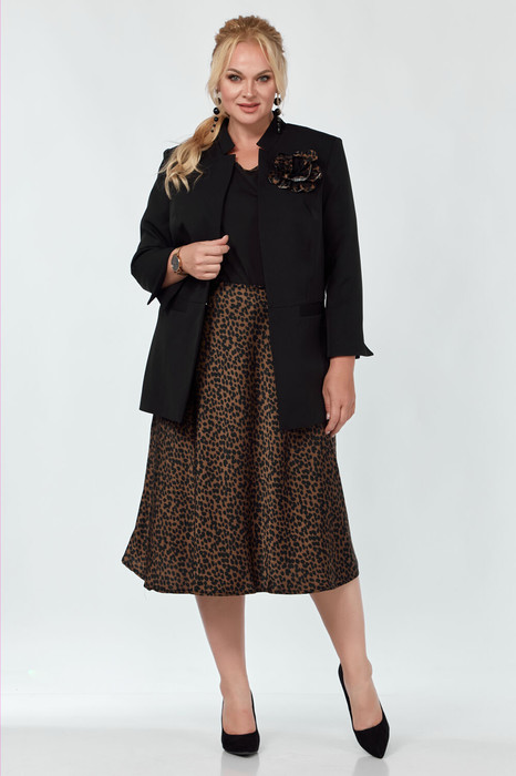 Блузка, юбка и жакет. Юбка А-образная на резинке. Блузка с целенокроенным рукавом . Жакет с воротником стойкой, подрезом по переду с карманом листочкой. Рукав втачной 3/ 4 с манжетом и разрезом. Жакет на подкладке.