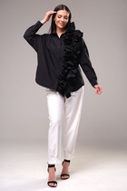 Жакет свободного силуэта, выполнен в стиле «Шанель» с накладными карманами, по краю карманов тесьма с вытрепанным краем. Застежка центральная на петли пуговицы, горловина круглая. Рукава втачные, длинные. Жакет на подкладке.