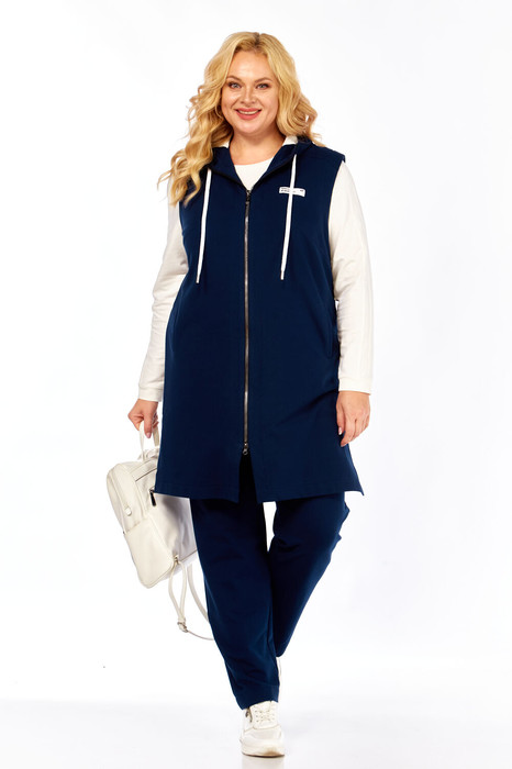 Жилет свободного силуэта, центральной застежкой на тесьму молния. По переду на уровне бедер прорезные карманы с листочкой, горловина оформлена капюшоном, по боковым швам разрезы.Жилет с капюшоном.