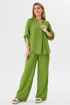 Брюки зауженные к низу с ассиметричным низом и разрезом в боковом шве. Застежка по линии банта на молнию. Верх брюк на поясе с резинкой по спинке.