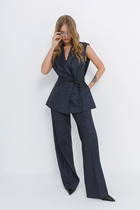 Жакет полуприлегающего силуэта, с центральной застежкой на одну пуговицу, борт с отворотом лацкана и воротником пиджачного типа. По переду накладные карманы с клапаном, рукава втачные с подрезом по линии локтя и патой для подхвата рукава на пуговицы. Жакет без подкладки. Все отделочные строчки на костюме выполнены контрастными нитками.