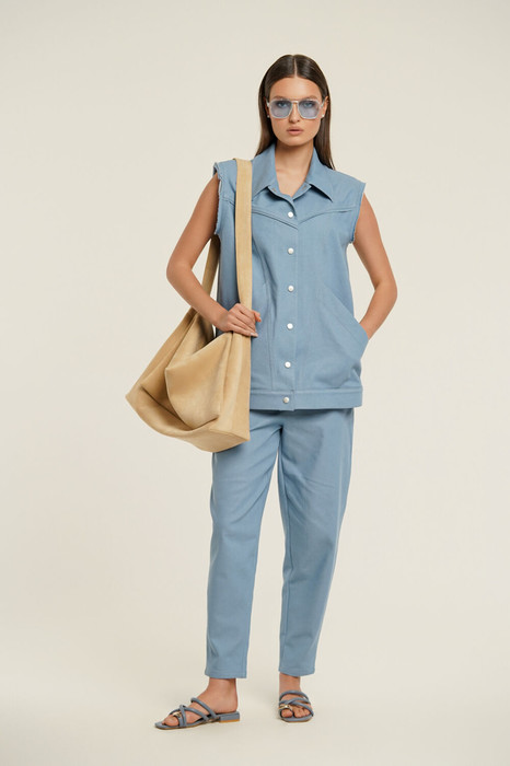 Комплект женский двухпредметный из легкой джинсовой ткани. Жилет свободного покроя с расширенным плечом и подплечниками, воротник отложной, застежка на кнопки. По переду и спинке фигурные кокетки, рельефы с декоративной отстрочкой. Карманы накладные, входящие в рельеф. По низу отрезной пояс. В швы кокеток и проймы вставлены канты с необработанным краем. Брюки бананы слегка укороченные. По переду фигурные карманы, на задних половинках брюк кокетки, накладные карманы. Застежка на молнию и петлю с пуговицей.