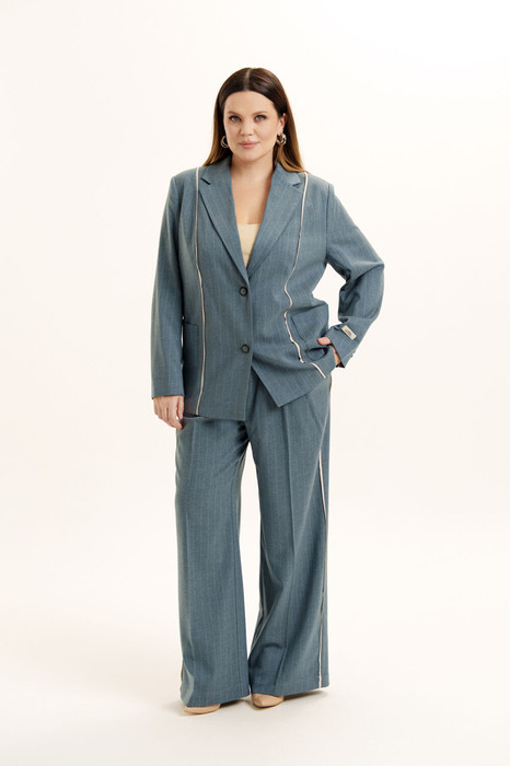 Комплект женский двухпредметный из смесовой ткани в полоску. Жакет прямого силуэта. Вырез горловины оформлен воротником пиджачного типа. Застежка - двубортная на петли с пуговицами. Линия плеча слегка расширена и усилена плечевыми накладками. Рукава двухшовные. На передних половинках жакета имеются накладные карманы. Изделие декорировано кантами из ткани контрастного цвета. Жакет посажен на подкладку. Брюки - прямые со стрелками. Пояс- отрезной с эластичной тесьмой. Имеются карманы с отрезными бочками. В боковых швах - отделочные канты. Есть шлевки для ремня.