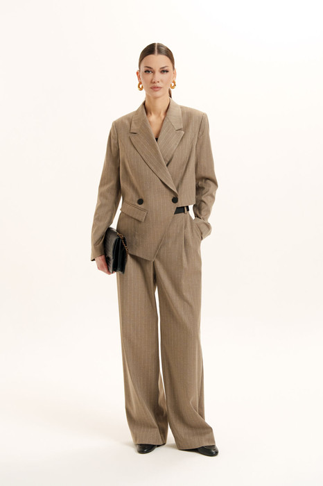 Костюм женский двухпредметный выполнен из костюмно-плательной ткани в полоску. Жакет ассиметричного кроя, прямого силуэта, вырез горловины оформлен воротником пиджачного типа, жакет имеет двубортную застежку на петли пуговицы. По переду, с одной стороны, обработан прорезной карман в рамку с клапаном. Рукава - втачные двухшовные с плечевыми накладками. Брюки - прямые. Пояс - отрезной с застежкой на молнию и петлю с пуговицей и частично на резинке. Имеются карманы с отрезными бочками и шлевки для ремня. Низ брюк обработан закрытым швом.