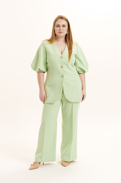 Костюм женский двухпредметный, жакет на подкладке. Жакет приталенного силуэта, с V-образной горловиной и рукавом фонариком на мажете. Жакет декорирован пуговицами. Брюки - прямые. Пояс - отрезной с застежкой на молнию и петлю с пуговицей и частично на резинке. Имеются карманы с отрезными бочками и шлевки для ремня. Низ брюк обработан закрытым швом. Отделочная фурнитура может меняться.