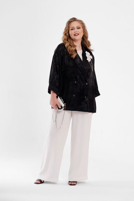 Жакет без подкладки прямого силуэта, застежка двубортная на петли и пуговицы. Воротник пиджачного типа.  Рукав отрезной на базе цельнокроеного, по низу манжет. Дополнен съемным украшением.