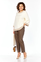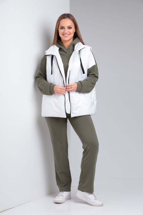Комплект брючный. Кофта прямого силуэта, линия плеча спущена,рукав втачной одношовный. Горловина обработана бейкой. По низу изделия и рукава манжеты. Центральная часть переда с отделочной деталью( с вышивкой). Брюки прямые, в боковых швах обработаны карманы, верхний срез обработан поясом с резинкой и шнурком. Жилетка женская утепленная с центральной застежкой на "молнию". Спинка со стяжкой. Перед с отрезными бочками и боковыми карманами "с листочкой". Воротник стойка с кулисой и шнуром из декорированной тесьмы. Низ жилетки округлой формы спереди короче, а спинка длиннее . Правый карман украшен нашивкой.