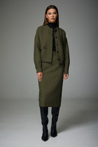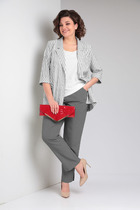 Комплект брючный:кофта +брюки+блузон. Жакет полуприлегающего силуэта с центральной застежкой на петлю и пуговицу. По спинке средний шов со шлицей, прорезные карманы с клапаном и обтачками. Рукав втачной. Воротник стояче-отложной с отрезной стойкой, лацканы с открытыми бртами. Капюшон съемный. Блузон полуприлегающего силуэта, рукав втачной одношовный, короткий. Брюки прямые, верхний срез обработан поясом с резинкой, по переду застрочены стрелки. В качестве отделки используется фурнитура.