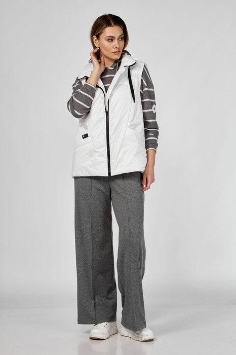 Комплект брючный(кофта+брюки+жилетка). Кофта прямого силуэта с втачным рукавом. По низу рукава и кофты приталенные манжеты. Капюшон со средним швом, фиксируется шнурком. Брюки расширенные к низу. Пояс на резинке. На передних половинах застрочены стрелки. Жилетка  утепленная с центральной застежкой на "молнию". Спинка со стяжкой. Перед с отрезными бочками и боковыми карманами "с листочкой". Воротник стойка с кулисой и шнуром из декорированной тесьмы. Низ жилетки округлой формы спереди короче, а спинка длиннее . Правый карман украшен нашивкой.