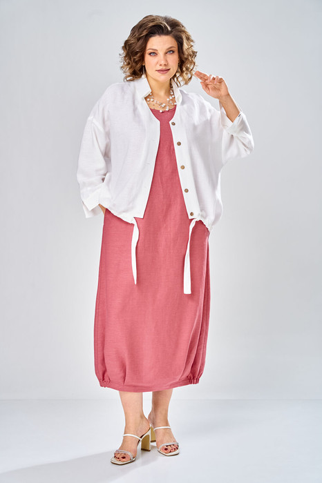 Комплект женский состоит из рубашки и платья. Платье длинное, свободного кроя. Спинка со среднем швом, разрезом, талиевыми вытачками, 2-мя складками по низу. Перед с нагрудными вытачками и складками по низу. Карманы обработаны в боковых швах. Низ платья по бокам собран  на резинку. Рубашка совбодного кроя с центральной застежкой на 5 петель и пуговиц. Спинка с округлым подрезом и отделкой в ивде надписи. Перед по низу фиксируется кулисой и завязками. Воротник на стойке с обработанной горловиной . Рукав втачной, одношовный со спущенной линией плеча. По низу рукава манжет с застежкой.