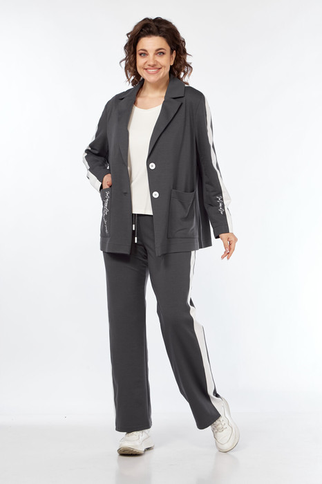 Комплект брючный( жакет+майка+брюки). Жакет полуприлегающего силуэта с центральной застежкой на петли и пуговицы. По спинке средний шов со шлицей. По переду вытачки, накладные карманы. Воротник стояче-отложной с открытыми бортами . Рукав втачной 2-шовный с лампасом переходящим на плечевой. Жакет без подкладки. Майка полуприлегающего силуэта. Горловина и пройма обработаны бейками. Брюки  прямые. верхний срез обработан поясом с резинкой со шнурком. По боковому шву лампас. Используется три ткани. В качестве отделки используется печать.