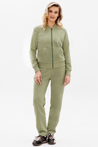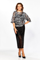 Комплект женский состоит из блузона и сарафана. Сарафан полуприлегающего силуэта, на бретелях, со средним швом на спинке, который заканчивается разрезом. По переду нагрудные вытачки, в боковых швах обработаны карманы. Блузон свободного кроя со спущенной линией плеча. Без застежки. Воротник стояче-отложной с отрезной стойкой. Внутренние срезы окантованы.