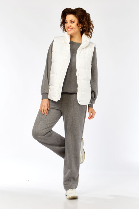 Комплект брючный( кофта+брюки+жилетка). Кофта прямого силуэта с притачным манжетом из отделочной ткани. Рукав покроя реглан с притачным манжетом по низу. В качестве отделки используется вышивка на центральной части переда. Брюки прямые. Верхний срез обработан поясом с резинкой. В боковых швах обработаны карманы. На передних половинках застрочены стрелки. Жилетка женская прямого силуэта с центральной застежкой на тесьму-молнию и отделочную планку на кнопки. Боковой шов смещенный на перед, в шве обработаны карманы. Воротник-стойка со складками по линии горловины. Жилетка двухсторонняя. Температурный режим до +5 градусов.