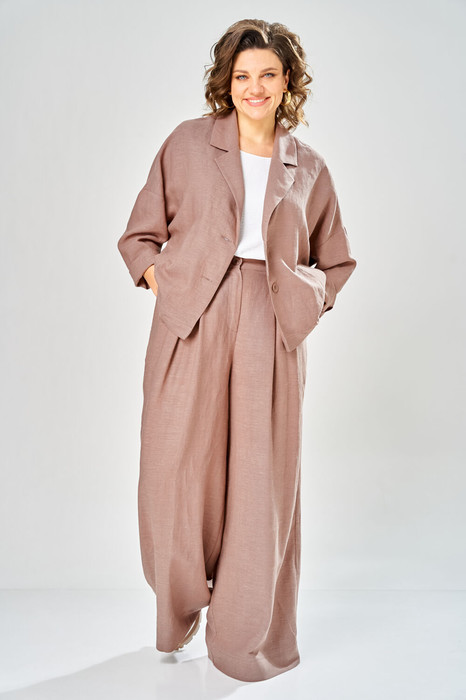 Комплект женский состоит из жакета и брюк. Жакет свободного кроя с застежкой на 2 петли и пуговицы. Перед с боковыми карманами "с листочкой". Рукав втачной, 2-шовный со спущенной линией плеча, спинка по низу частично на резинке. Воротник отложной с лацканами. Жакет без подкладки.Брюки широкие. Передние половинки брюк со складками внахлест, с боковыми карманами. Застежка спереди на молнию, передние половинки брюк с вытачками. Пояс по спинке на резинке.
