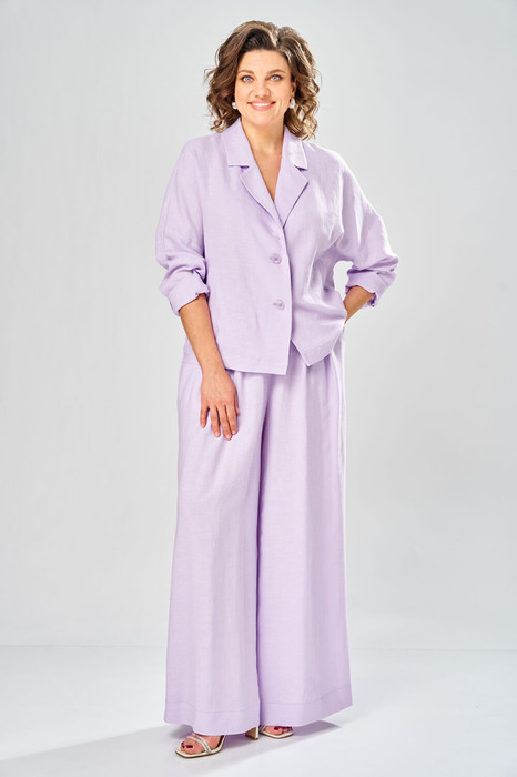 Комплект женский состоит из жакета и брюк. Жакет свободного кроя с застежкой на 2 петли и пуговицы. Перед с боковыми карманами "с листочкой". Рукав втачной, 2-шовный со спущенной линией плеча, спинка по низу частично на резинке. Воротник отложной с лацканами. Жакет без подкладки.Брюки широкие. Передние половинки брюк со складками внахлест, с боковыми карманами. Застежка спереди на молнию, передние половинки брюк с вытачками. Пояс по спинке на резинке.