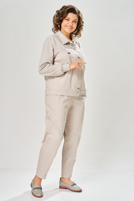 Комплект брючный состоит из жакета и брюк. Жакет полуприлегающего силуэта с центральной застежкой на петли и пуговицы. По  переду кокетка, рельефные швы до низа, отрезной пояс по низу. Рукав втачной , одношовный полной длины с манжетом. Воротник стояче-отложной. Брюки зауженные к низу, застрочены вытачки, на передних половинках на уровне колена застрочены вытачки, в боковых швах обработаны карманы с листочкой, на задней половинке накладные карманы.Пояс с резинкой и шнурком.