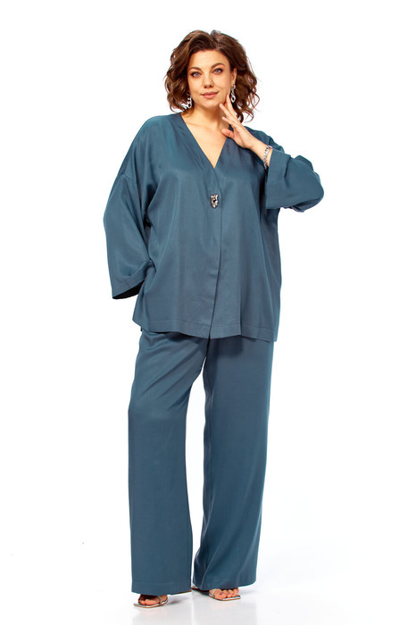 Комплект брючный свободного кроя состоит из кардигана и брюк. Брюки свободного кроя прямые с карманами в боковых швах и поясом на резинке. Кардиган с центральной застежкой на 2 потайные кнопки. Перед с V-образной горловиной, украшен брошью. Рукав втачной одношовный со спущенной линией плеча. По боковым швам разрезы. По бортам широкая отделочная полочка. Фурнитура может отличаться от заявленной на фото.