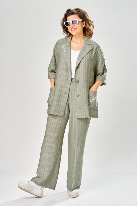 Комплект женский состоит из брюк и жакета. Брюки прямые, свободного кроя с карманам в  боковых швах и поясом на резинке. Жакет прямого кроя с центральной застежкой на 3 петли и пуговицы. Перед с боковыми накладными карманами, левый карман украшен печатью. Воротник отложной с лацканами, правый лацкан украшен печатью. Рукав втачной со спущенной линией плеча. В боковых швах обработаны разрезы. Длина по спинке 72-74 см, длина рукава 29-30 см. Длина брюк 107-108 см.