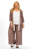 Комплект женский состоит из брюк и жакета. Брюки прямые, свободного кроя с карманам в  боковых швах и поясом на резинке. Жакет прямого кроя с центральной застежкой на 3 петли и пуговицы. Перед с боковыми накладными карманами, левый карман украшен печатью. Воротник отложной с лацканами, правый лацкан украшен печатью. Рукав втачной со спущенной линией плеча. В боковых швах обработаны разрезы. Длина по спинке 72-74 см, длина рукава 29-30 см. Длина брюк 107-108 см.