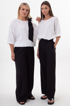 Брюки - палаццо с центрально застежкой на тесьму молнию с гульфиком и откоском; с притачным поясом со шлевками, застегивающимся на 1 прорезную петлю и пуговицу. Задняя часть пояса - на резинке. ПП брюк со складками, переходящими в стрелки и боковыми карманами. ЗП брюк с 2-мя парами таллиевых вытачек и стрелками.