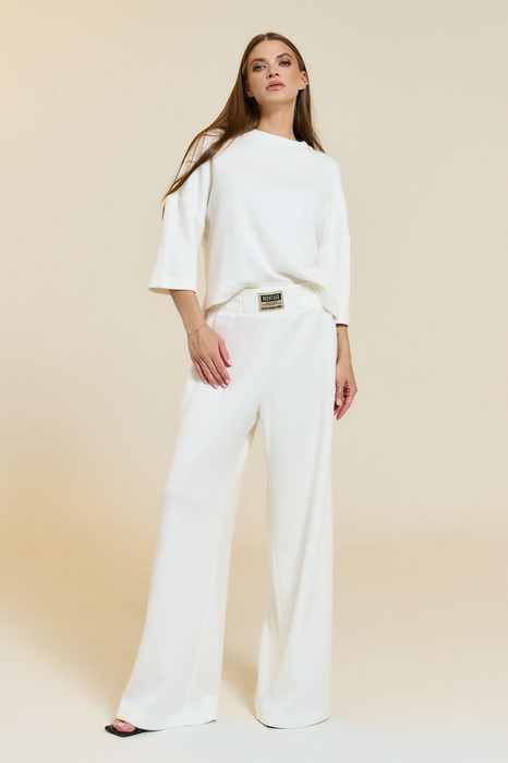 Костюм женский из трикотажа в спортивном стиле. Джемпер прямого силуэта с короткими спущенными рукавами. Горловина джемпера обработана притачной бейкой. По горловине спинки шов притачивания бейки обработан киперной тесьмой. Брюки прямого покроя "палаццо". Пояс стачной, на центральную часть пояса настрочена нашивка. По эластичной тесьме проложены 2 отделочные фиксирующие строчки. Низ джемпера, низ рукавов и низ брюк подшит на плоскошовной машине.