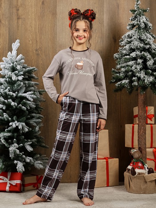 Костюм для девочки из трикотажного полотна "кулирка" в комбинации двух видов: гладкокрашенного и с рисунком в крупную клетку, сочетающихся между собой по цвету, состоящий из джемпера и брюк. Джемпер - из гладкокрашеного полотна, свободного покроя, с длинными втачными рукавами и приспущенными плечами, с горловиной овальной формы и тематическим принтом, выполненным в технике шелкографии. Горловина, нижние срезы рукавов и низ изделия обработаны подгибкой с отделочным широким кантом контрастного цвета. Брюки - из полотна в клетку, свободного покроя, прямые, на притачном поясе с эластичной тесьмой внутри, с карманами в боковых швах. Нижние срезы обработаны подгибкой.