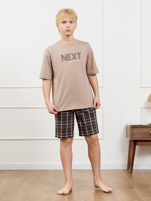 Костюм для мальчика из трикотажного полотна "кулирка", состоящий из футболки и шорт. Футболка классического покроя, с короткими втачными рукавами и приспущенной линией плеч, горловиной овальной формы, обработанной втачной планкой и принтом на детали переда, выполненным в технике шелкографии. Нижние срезы рукавов и изделия обработаны подгибкой. По горловине настрочена отделочная строчка. Шорты длиной до колен, на притачном поясе с эластичной тесьмой внутри, с карманами в боковых швах. Нижние срезы обработаны подгибкой.