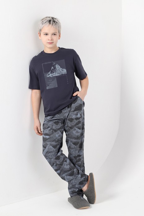 Костюм для мальчика из трикотажного полотна "кулирка" в комбинации двух видов , состоящий из футболки и брюк. Футболка - из гладкокрашеного полотна, свободного покроя, со спущенным плечом, короткими втачными рукавами, горловиной овальной формы, обработанной втачной планкой, и принтом в центре переда. По шву втачивания планки настрочена двойная отделочная строчка. Брюки - из полотна с набивным рисунком, на притачном поясе с эластичной тесьмой внутри, с карманами в боковых швах. Входы в карманы окантованы основным материалом.
