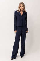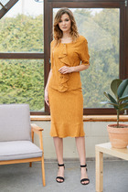 Молодёжный костюм выполнен из ткани в мелкую полоску под джинсу. По низу рукавов кофты и шорт на ткани выполнен красивый принт-пуф, имитирующий вышивку. Верх кофты и шорт на резинке, благодаря чему получился эффект рюши — очень модной в этом сезоне.