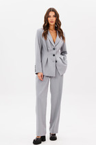 Комплектация из блузы и брюк. Блуза прямого силуэта, выполнена из нежной, приятной ткани, стойкой к сминанию. Воротник классический, рубашечный на отрезной стойке, эстетично подчеркнут вырез горловины, что придает изделию дополнительный образ. Рукав втачной, низ обработан притачной манжетой. По спинке заложена и застрочена бантовая складка. Низ изделия асимметричный. Брюки слегка зауженные к низу. Пояс притачной, частично на резинке. Застежка спереди брюки на тесьму-молнию, петлю-пуговицу.
