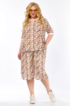Комплект 2-х предметный, состоит из блузы и брюк. Женственная блуза свободного силуэта, выполнена из струящейся принтованной ткани. Эстетично подчеркнут V-образный вырез горловины, что служит декоративным элементом изделия. Рукав втачной, свободный, создает современный стиль образу, низ рукава на резинке вкруговую. Спинка с кокеткой и бантовой складкой по центру. В боковых швах предусмотрены разрезы. Брюки с заутюженными стрелками слегка зауженные к низу, полной длины. Пояс притачной, частично на резинке. Застежка на тесьму-молнию и пуговицу