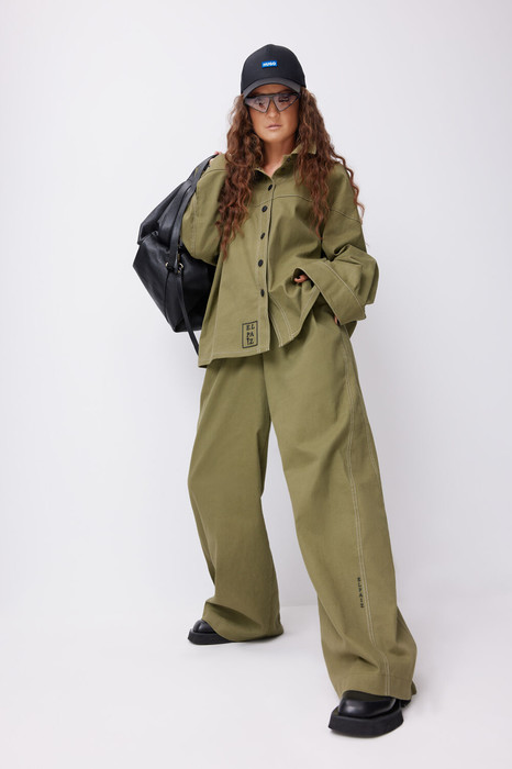 Комплект женский состоящий из рубашки и брюк. Рубашка свободной формы с рукавом реглан заканчивающийся притачной манжетой с кнопкой, низ рукава с тремя складками и разрезами, воротник рубашечного типа с отрезной стойкой, спинка с глубокой встречной складкой и горизонтальным подрезом. Перед с горизонтальной кокеткой с застежкой на кнопки и декоративным брендированным элементом по низу. Брюки прямого силуэта на притачном поясе с резинкой по спинке, застежка брюк - гульфик с кнопкой. Задняя часть брюк с талиевыми вытачками и декоративными листочками. Передняя часть брюк с карманами и с 4 складками(по две с каждой стороны). По бокам брюк треугольные вставки. Комплект с декоративными строчками контрастного цвета.