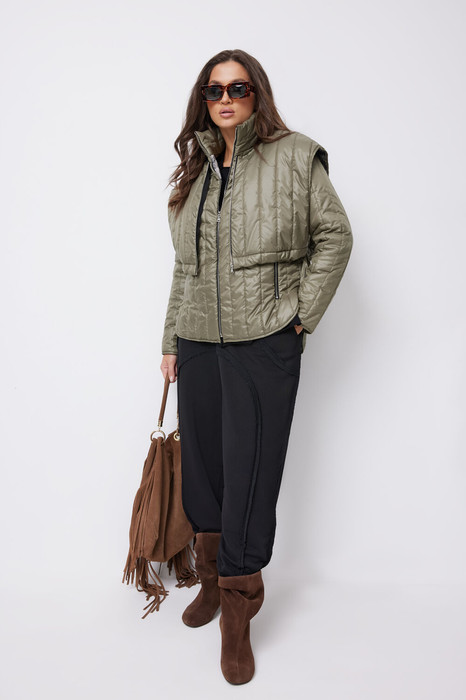 Комплект женский, состоящий из куртки, жилета и брюк. Куртка прямого силуэта, со спущенной линией плеча, рукава втачные длинные, воротник-стойка, застежка на тесьму молнию, на передней части расположены карманы с тесьмой молнией, куртка фигурными разрезами в боковых швах, край борта, низ куртки и низ рукавов окантованы. Жилет: свободной формы с круглой горловиной с застежкой молнией, низ жилета выполнен ввиде кулисы, край борта, горловины и проймы окантованы, на спинке жилета расположена настрачная декоративная нашивка.  Брюки свободной формы (бананы) на притачном поясе с резинкой и декаротивным шнуром, брюки с заниженной линией сидения, в боковых швах карманы, на задней части брюк с левой стороны декоративный накладной карман, перед с фигурными авторскими рельефами, рельефы переда и боковые швы с открытым срезом.
