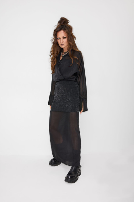 Комплект женский, состоящий из рубашки и юбки. Рубашка с длинным цельнокроеным рукавом, заканчивающимся притачной манжетой (на застежку пуговицу). Воротник стояче-отложной. Перед рубашки с застежкой на планку, петли и пуговицы. Перед с накладными карманами. В боковых швах разрезы. Юбка прямого силуэта, длинная, состоящая из двух видов ткани. Выполнена, как имитация двойной юбки. Верх юбки на обтачке, застежка - молния в среднем шве спинки. Нижняя юбка с высокими боковыми разрезами.