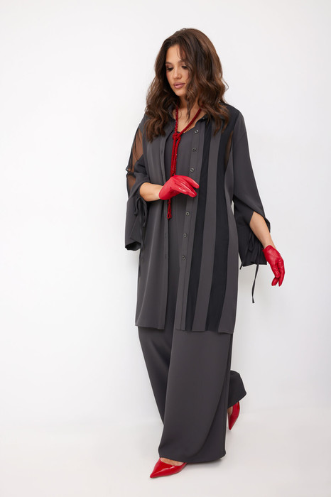 Комплект женский, состоящий из комбинезона и рубашки.  Комбинезон прямого силуэта. Вырез горловины по переду и спинке V-образный. Застежка в среднем шве спинки на потайную молнию. В боковых швах карманы. Рубашка прямого силуэта. Левая часть переда со вставками из отделочной ткани (сетки). Спинка с кокеткой и вставкой из отделочной ткани. Застежка на петли и пуговицы на планке. Воротник рубашечного типа, линия плеча спущенная. Рукав втачной,  с широкой манжетой и завязкой на шнурки. Правый рукав со вставкой из отделочной ткани. В боковых швах высокие разрезы.