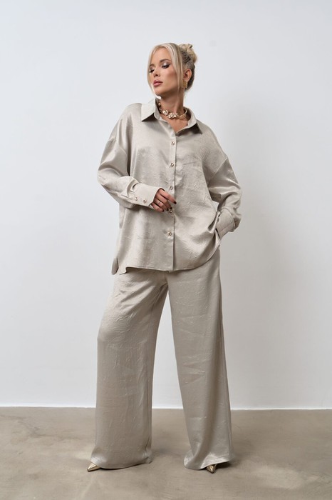 Рубашка свободного кроя и широкие брюки создают ощущение лёгкости и комфорта, при этом силуэт остаётся элегантным.