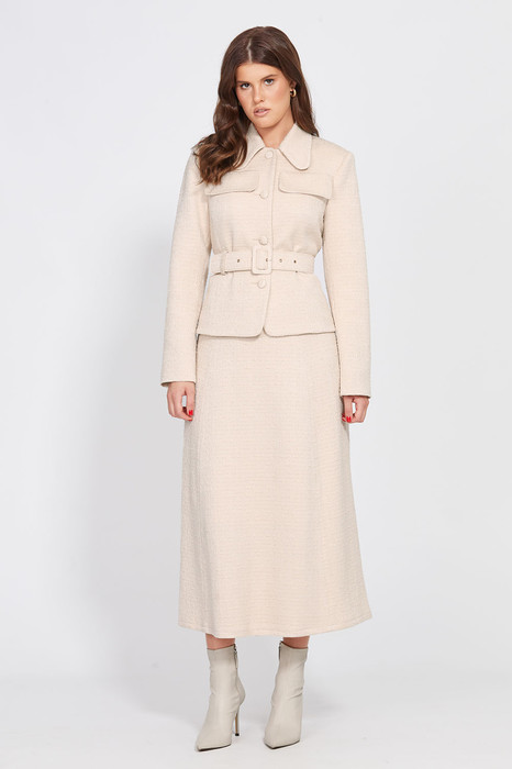 Комплект: жакет + юбка. Комплект выполнен из твида. Жакет полуприлегающего  силуэта, длиной выше линии бедер. Застежка спереди центральная бортовая на пуговицы. Спинка со средним швом и талиевыми вытачками. Рукав втачной, двухшовный. Жакет на притачной по низу подкладке. Юбка расширена к низу, на притачном поясе, длиной миди. Застежка в левом боковом шве на пуговицу и потайную молнию. Переднее и заднее полотнище состоит из трех клиньев. Юбка на отлетной по низу подкладке. В комплект входит ремень из основной ткани с обтяжной пряжкой.