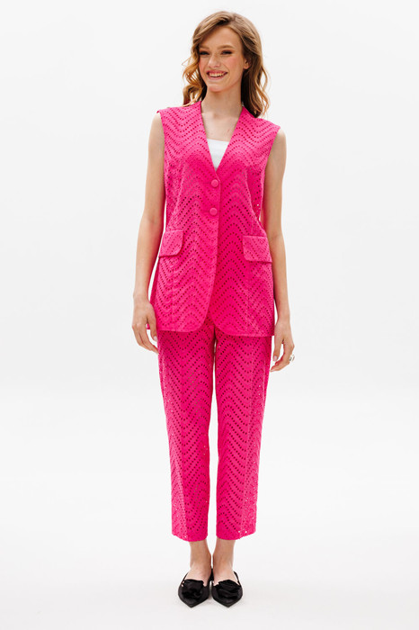 Комплект: жилет + брюки. Комплект выполнен из хлопка с вышивкой. Жилет полуприлегающего силуэта длиной ниже линии бедер. Спереди обработаны рельефы, декоративные клапаны и центральная бортовая застежка на пуговицы. Борт закругленной формы. Горловина V-образной формы. На спинке средний шов. Брюки свободного покроя, длиной 7/8, зауженные к низу, на притачном поясе с эластичной тесьмой. Спереди по бокам обработаны карманы с наклонным входом и застежка на молнию. Передняя и задняя часть брюк заутюжена на кант. Брюки на короткой отлетной подкладке в виде шорт. Топ в комплект не входит.
