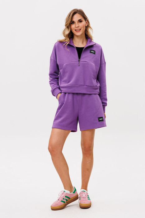 Комплект: джемпер + шорты. Комплект выполнен из трикотажного полотна. Джемпер свободного силуэта, длиной чуть ниже линии талии. Спереди накладной карман. Застежка на молнию спереди от кармана до верха. Спинка цельная. Воротник-стойка. Плечевой шов спущен. Низ рукава на манжете. Джемпер декорирован нашивкой.  Шорты свободного покроя, на притачном поясе с эластичной тесьмой. Спереди боковые карманы с наклонным входом. Шорты декорированы нашивкой.