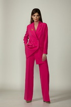 Костюм 2х предметный состоит из жакета и брюк. Ассиметричный жакет с фальш-рубашуой выполнен из сочетания костюмной ткани и рубашечного хлопка. Рукав втачной с манжетой по низу, горловина- стойка с отложным воротником. По полочке изделия расположены карманы с клапаном и лацканы. застежка петля пуговица по планке и кнопка на борте. брюки прямого кроя с высокой посадкой на притачном поясе с резинкой. застежка- молния на гульфике + кнопка на поясе