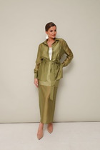 Костюм женский Юбочный 2х мпедметный состоит из жакета и юбки, выполнен из Костюмной ткани. Жакет полуприлегающего силуэта, с втачным рукавом 3/4, по низу рукава манжет, горловина со стойкой, застежка- молния. По переду и спинке жакета расположены выточки и рельефы. Юбка женская выполнена в стиле "бохо", в силуэте "тюльпан" с отрезными деталями пои защипами по низу. Изделие на притачном поясе кокетке и застежкой- потайная молния.
