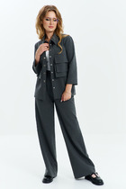 Костюм 3-х предметный, состоит их рубашки, юбки, галстука. Выполнен из костюмной ткани. Рубашка прямого кроя без подкладки, по полочке расположены накладные декоративные элементы и карманы с клапаном. спинка с отрезной кокеткой и таллиевыми выточками. Воротник отложной на стойке, рукав втачной 7/8. Юбка изделия на притачном поясе с резинкой, застежка потайная молния, по низу юбки расположена шлица, юбка с подкладкой.
