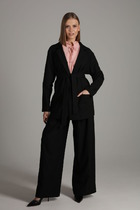 Костюм женский двухпредметный, состоит из жакета и брюк. Жакет свободного кроя со спущенным рукавом и английским отложным воротником с лацканами. По полочкам изделия расположены прорезные карманы с клапаном. Рукав и полочка изделия выполнены из ткани-компаньона. Брюки классического кроя, завышенной посадки на притачном поясе с эластичной лентой, в боковых швах брюк расположены функциональные карманы