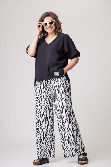 Комплект женский двух предметный состоящий из блузы и брюк. Блуза свободного силуэта с фигурным низом, выполнена из хлопка в сочетании с отделочной тканью. По переду вырез горловины V-образный обработан обтачкой из отделочной ткани, по спинке фигурный вырез закреплён завязками из отделочной ткани, рукав втачной по низу стянут тонкой резинкой с фиксатором, низ спинки блузы обработан обтачкой из отделочной ткани, перед стянут тонкой резинкой с фиксаторами. Декором служит нашивка по переду блузы. Брюки прямого свободного кроя. Пояс брюк на резинке со шнуром. В боковых швах-карманы.