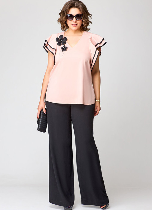 Костюм женский двухпредметный нарядно-повседневнй состоящий из блзы и брюк. Блуза прямого силуэта с фигурным низом, выполнена из хлопка. Вырез горловины круглый на обтачке, рукава втачные двойные "крылышки". В боковых швах обработаны разрезы. Декором служит контрасная окантовка на рукавах и съемная отделочная брошь в виде двух цветов с цепочкой. Брюки "палаццо" на притачном поясе. Пояс по кругу на широкой резинке, в боковых швах обработаны карманы.