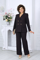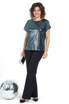 Костюм женский нарядно-повседневный состоящий из блузы и юбки. Блуза прилегающего силуэта выполнена из ткани 2х дизайнов: хлопка и экокожи на хлопковой основе. Вырез горловины V-образный с воротничком, рукав втачной со складками по пройме и притачной манжетой по низу рукава. Застежка на кнопки. По полочке и спинке фигурная притачная деталь из экокожи в виде имитации карсета, по талии отрезная двойная баска (лицо - экокожа, изнанка - хлопок). Декором служит сьемный пояс из экокожи. Брюки классические на притачном поясе зауженные к низу. Пояс частично на резинке, застежка гульфик на молнии. В боковых швах обработаны карманы. Выполнены из костюмной ткани.