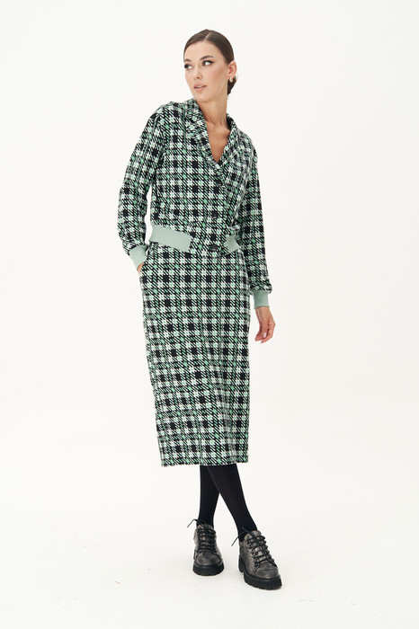Холодный осенний сезон вовсе не повод отказываться от красивых костюмов, тем более, что среди трендовых моделей есть очень комфортные, уютные и тёплые. Жаккардовое смесовое трикотажное полотно в стилизованную гусиную лапку в модном цветовом решении. Жакет без подкладки, свободного силуэта со слегка заниженной линии плеча. Застёжка центральная на петли и пуговицы, воротник - классический английский. По низу рукавов и жакета - контрастный довяз. Юбка прямая, на притачном поясе, с боковыми наклонными карманами на передней половинке и отрезной кокеткой, средним швом и накладными карманами на задней. Застёжка в среднем шве спинки, пояс с эластичными вставками. Длина жакета около 52 см. Длина рукава около 60 см. Длина юбки около 68 см.