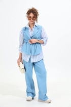 Свободная блуза А-силуэта, покроя реглан с круглым вырезом горловины. Низ изделия с отделочной полоской и бахромой.